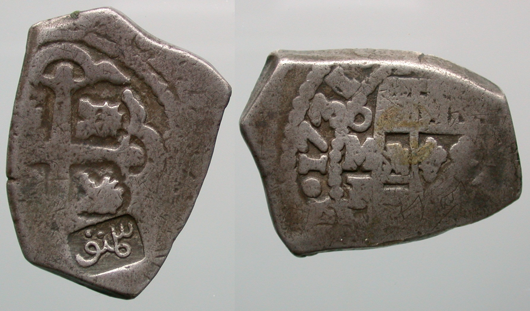This countermark is found on Spanish-American Pieces of Eight (8 Reales) and its denominations, dated 1729 - 1732. Other countermarks such as a flower (S7) and/or the Arabic number (1)230 (S8) are sometimes seen with the Sumanep countermark and thus also attributed to Sumanep.