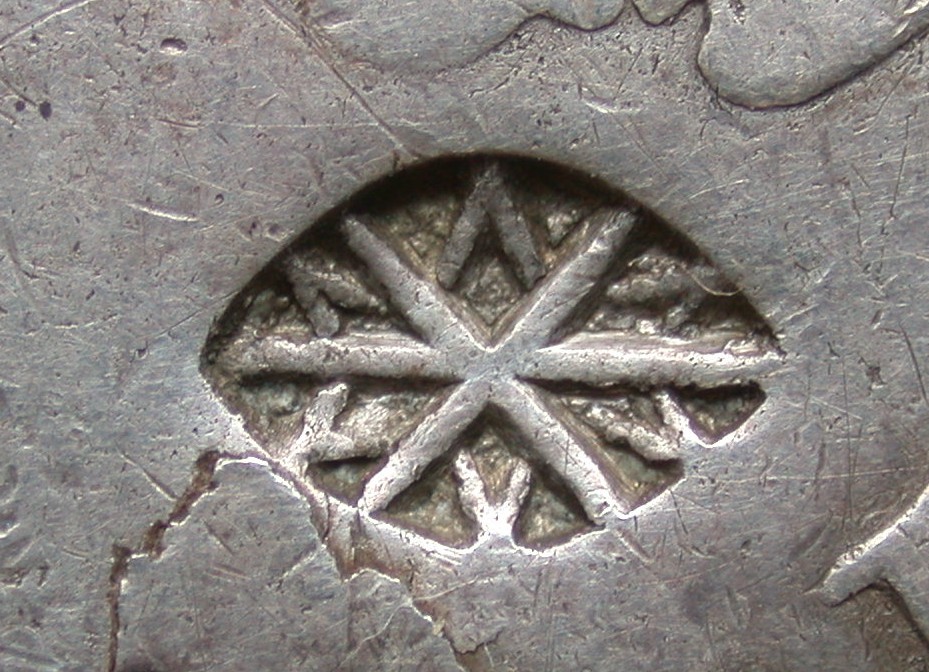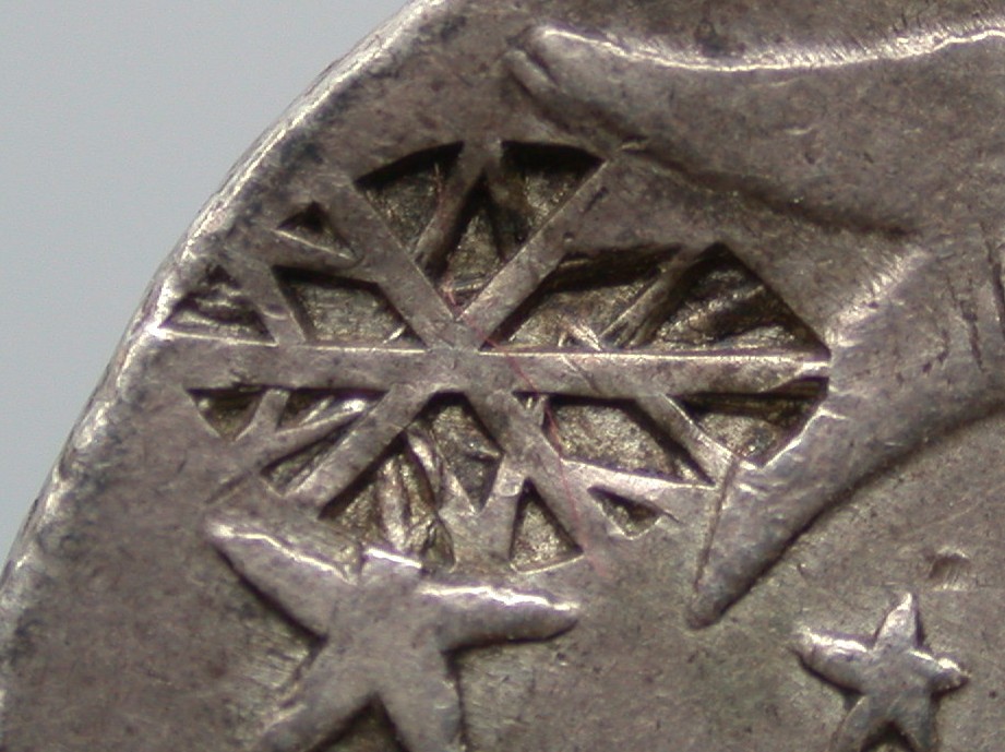 The second variant of the Madura Star is in the shape of a pointed oval with a flower-like design (S1d). This countermark is mainly applied on Rupee-sized coins, such as silver rupees (maily from Java), Gerneraliteits-guilders, Quarter Pagoda of British India, and Spanish 4 Real.